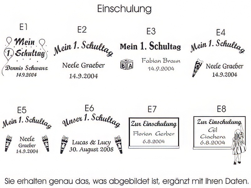 mit Namen des Schulkindes, demDatum des 1. Schultages undEinschulungs-Motiv(z. B. E11+)