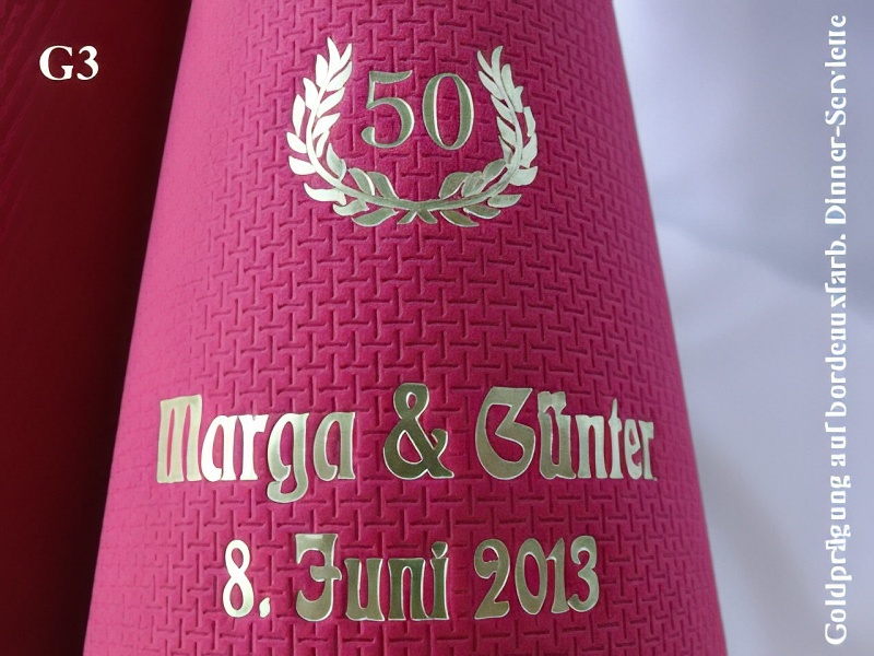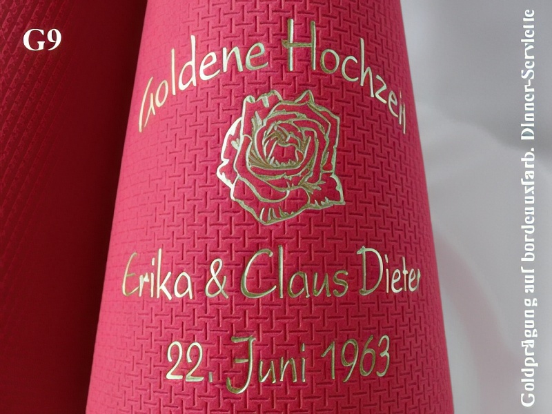 Eleg.-Dinner-Servietten bordeaux, bedruckt mit Goldprägung und Goldhochzeits-Motiv: G9 (Rosenblüte)Eleg.-Dinner-Servietten bordeaux, bedruckt mit Goldprägung und Goldhochzeits-Motiv: G3 (Jubiläumskranz)Eleg.-Dinner-Servietten dunkelgrün, bedruckt mit Goldprägung und Motiv Party/Feier: F3 (Guten Appetit …)Eleg.-Dinner-Servietten champagner, bedruckt mit Goldprägung und Goldhochzeits-Motiv: G10 (Doppelherzen)Eleg.-Dinner-Servietten bordeaux, bedruckt mit Goldprägung und Goldhochzeits-Motiv: G9 (Rosenblüte)