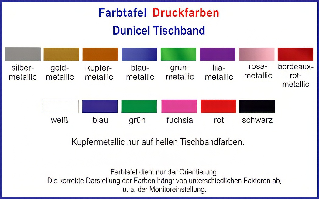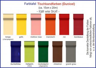 Achtung: Die Farben des Tischbandes entsprechen denen unserer Dunilin- bzw. Dunicel-Servietten und Serviettentaschen. Sie unterscheiden sich jedoch -trotz gleicher Farbnamen- von den Farben unserer Eleg.-Kaffee-Servietten bzw. Eleg.-Dinner-Servietten. Sie können bei den Eleg.-Servietten aber kombinieren, z. B. Servietten in champagner (beige) und das Tischband in chestnut (braun).