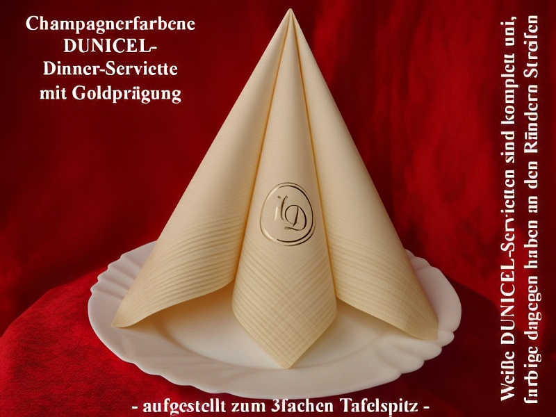 DUNICEL-Servietten zeichnen sich durch eine glatte Oberfläche und ihr hohes Flächengewicht aus. DUNICEL-Servietten sind aus einer Art Papier, heben sich aber von anderen Servietten, die aus Papier hergestellt werden, ab. Sie sind daher eine echte Alternative zu Stoffservietten.