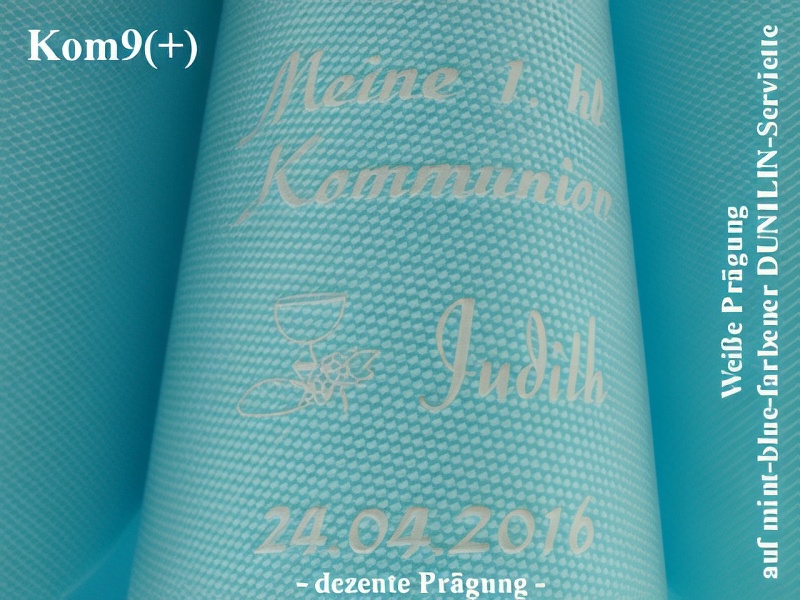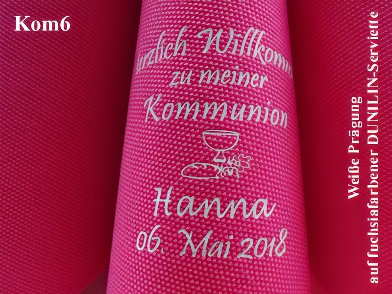 Dunilin-Dinner-Servietten fuchsia, bedruckt mit weißer Prägung und Kommunions-Motiv: Kom6 (Weinkelch)Motive Kommuion– Seite 1Motive Kommuion– Seite 2Motive Kommunion– Seite 3Dunilin-Dinner-Servietten soft violett bedruckt mit Lilametallicprägung und Kommunions-Motiv: Kom11 (Hostie, Weinkelch)Dunilin-Dinner-Servietten dunkelblau, bedruckt mit Silberprägung und Kommunions-Motiv: Kom13 (Fische)Dunilin-Dinner-Servietten beige (champagner), bedruckt mit dunkelblauer Prägung und Kommunions-Motiv: FischeDunilin-Dinner-Servietten mint blue bedruckt mit weißer Prägung und Kommunions-Motiv: Kom9(+) (Brot&Weinkelch)