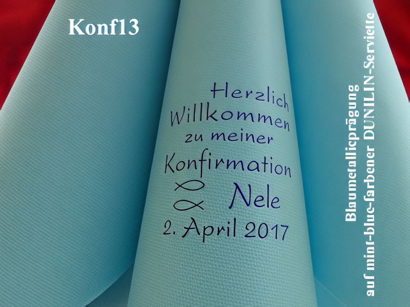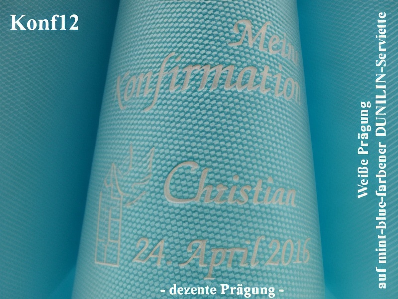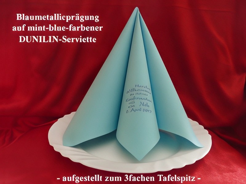Dunilin-Dinner-Servietten mint blue bedruckt mit weißer Prägung und aufgestellt zum 3-fachen Tafelspitz,Kommunions-Motiv: Kom9(+) (Brot&Weinkelch)Dunilin-Dinner-Servietten mint blue bedruckt mit Blaumetallicprägung und Konfirmations-Motiv: Konf13 (Fische)Dunilin-Dinner-Servietten mint blue bedruckt mit Blaumetallicprägung und Konfirmations-Motiv: Konf13 (Fische)Dunilin-Dinner-Servietten cafe, bedruckt mit Silberprägung und Konfirmations-Motiv: Konf6 (Brot, Weinkelch)Dunilin-Dinner-Servietten fuchsia, bedruckt mit Silberprägung und Konfirmations-Motiv: Konf13 (Fische)Dunilin-Dinner-Servietten plum bedruckt mit Goldprägung und Konfirmations-Motiv: Konf17 (Taube unter 4 Bögen)Dunilin-Dinner-Servietten mint blue bedruckt mit weißer Prägung und Konfirmations-Motiv: Konf12 (Taube)