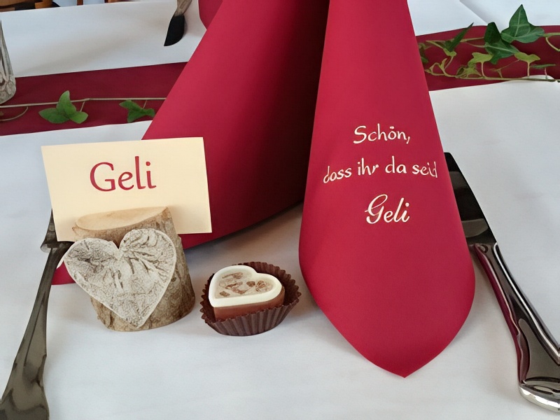 Wenn nichts anderes vereinbart ist, platzieren wir die Prägung so, daß die Servietten auf den Teller gelegt oder zum 2fachen Tafelspitz aufgestellt werden können und die Prägung auf der rechten Schlaufe zu sehen ist.