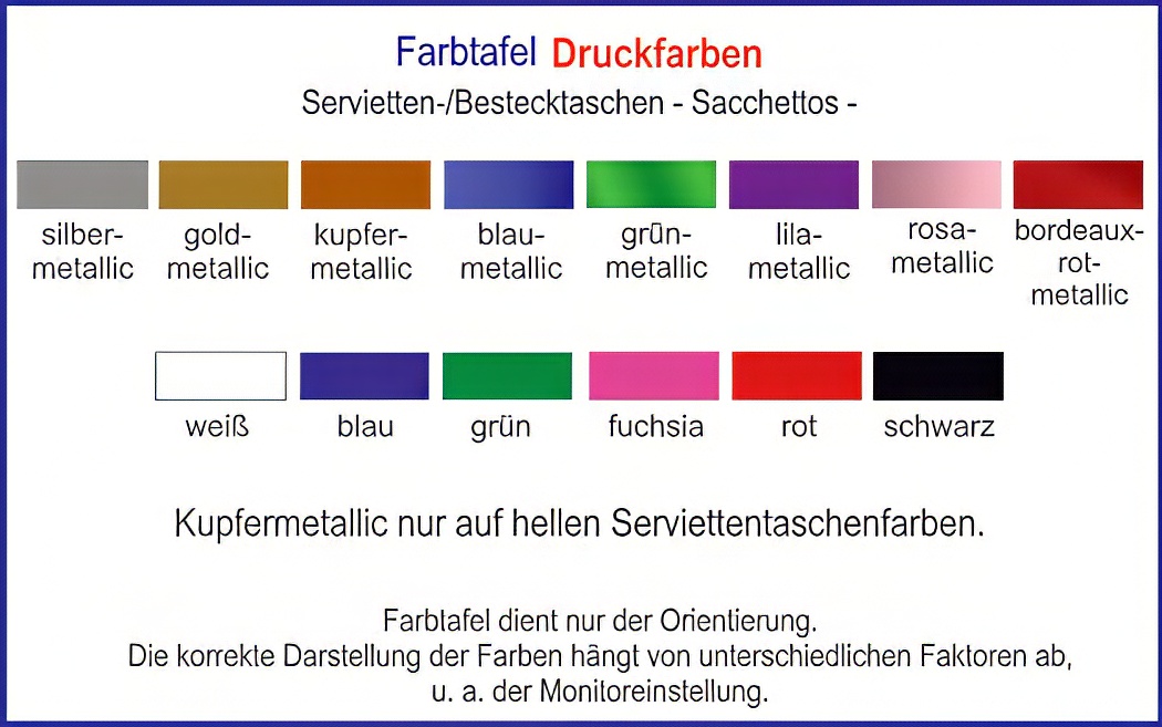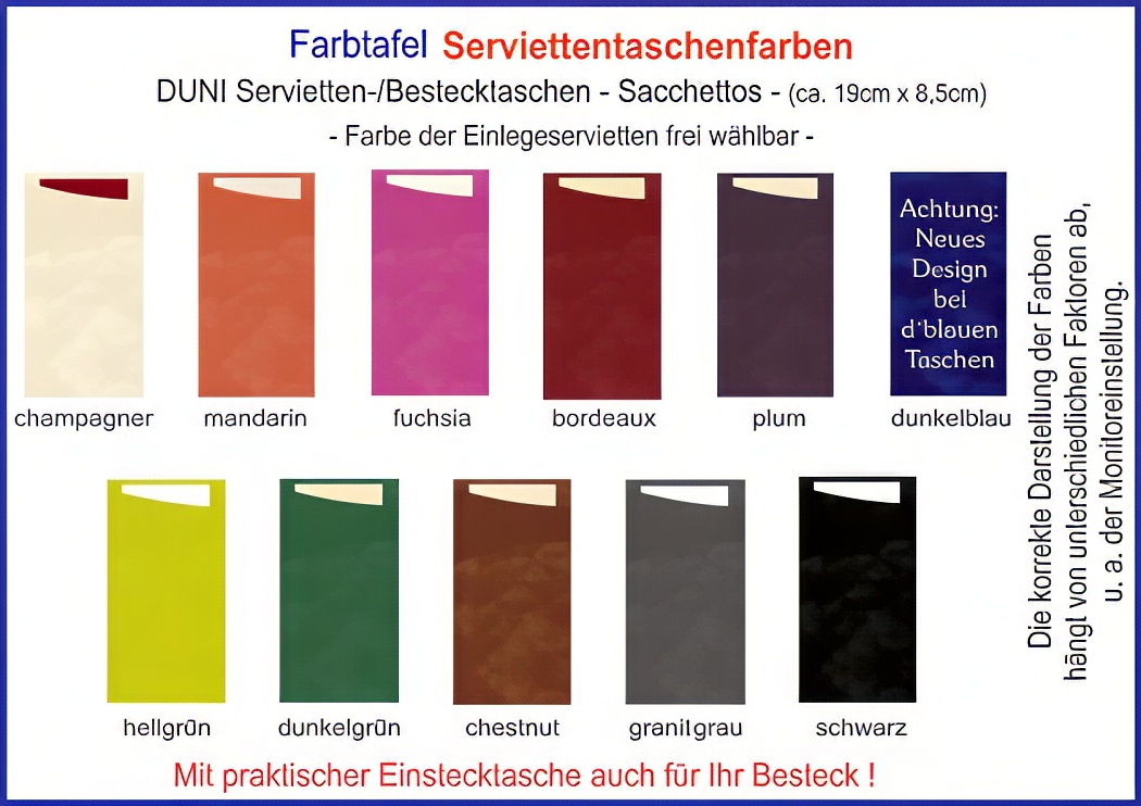 (Einlegeservietten sind nicht bedruckt)Durch die Bestückung mit Servietten und Besteck ‚in Einem‘ sind die Sacchettos® Serviettentaschen